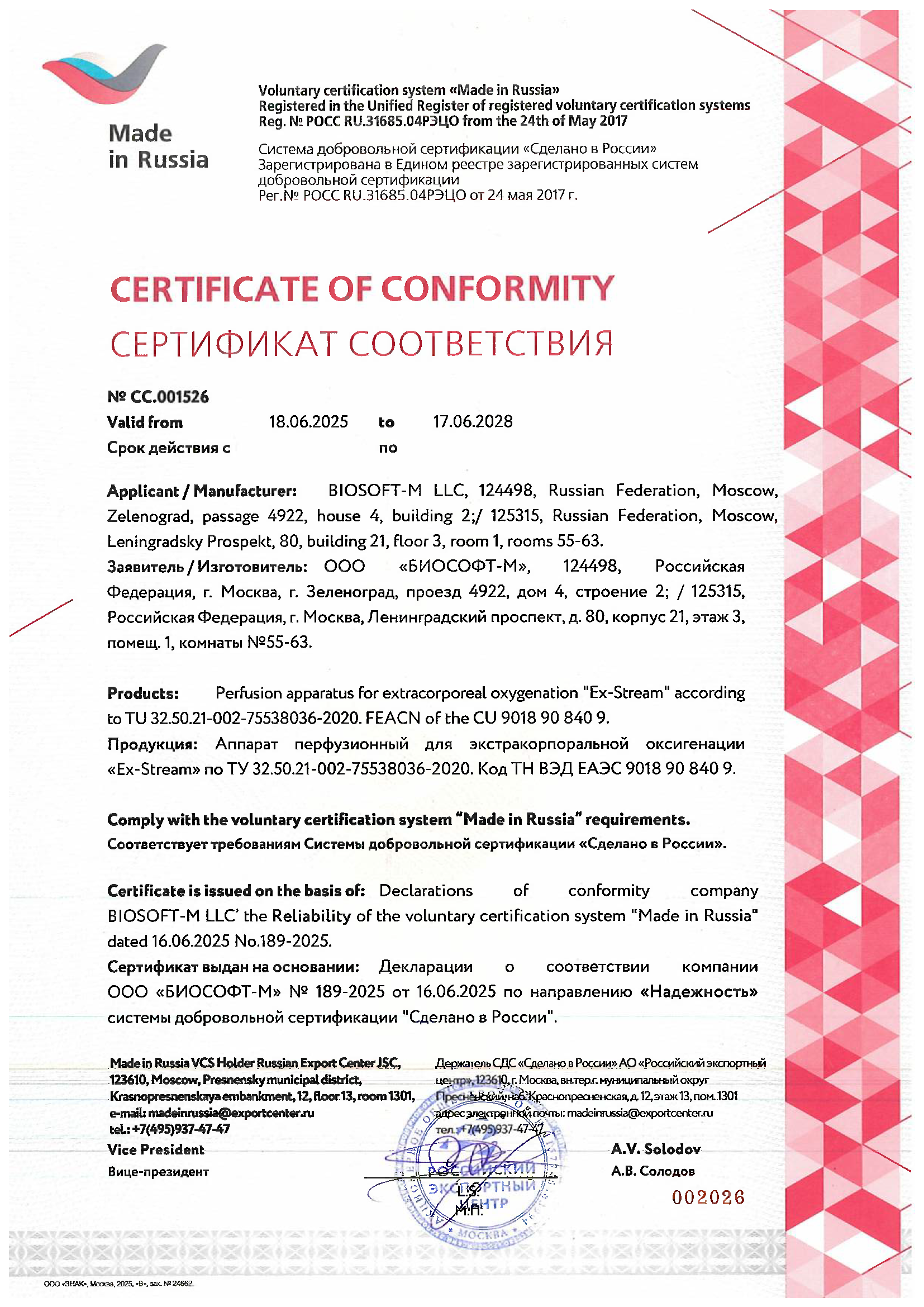 Ex-Stream предназначен для поддержания функции сердца и легких у пациентов в критическом состоянии при острой кардио и кардиореспираторной недостаточности, создающей угрозу жизни или значительного вреда здоровью больного, а также для проведения экстракорпоральной перфузии с целью восстановления и поддержания жизнеспособности донорских органов для последующей трансплантации.
