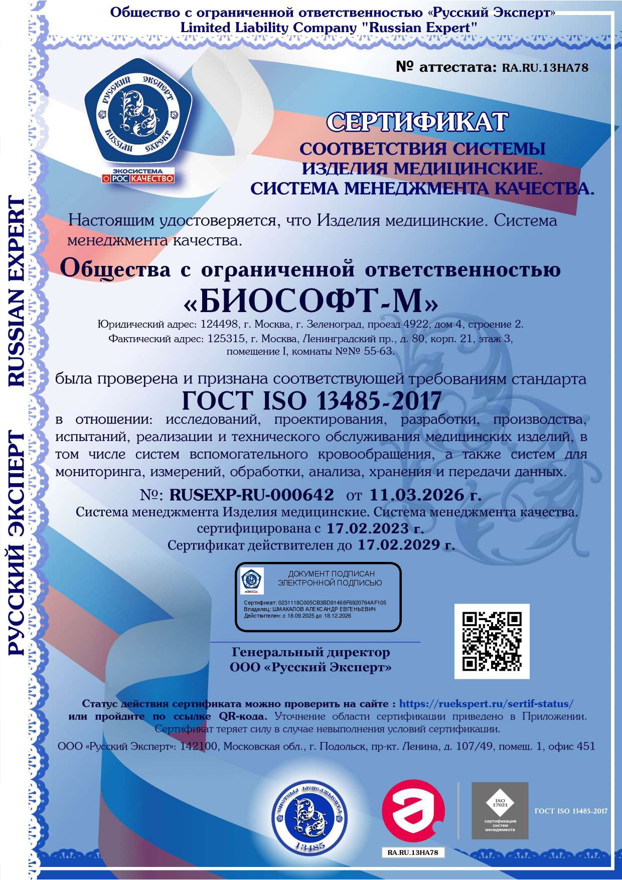 Ресертификационный аудит системы менеджмента (СМ) ООО «БИОСОФТ-М» показал соответствие требованиям ГОСТ Р ИСО 9001-2015 и ГОСТ ISO 13485:2017 в системе сертификации Русского Эксперта с аккредитацией Федеральной службы по аккредитации РФ («Росаккредитация»).